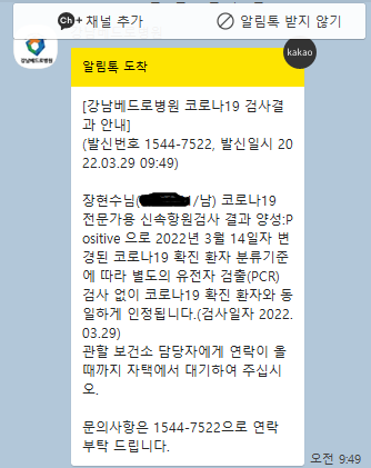 2022.3.29 확진 1일차 2년간 잘 피해 다녔다고 했는데. 간밤에 미친 듯한 열과 함께 잠을 한숨도 못잤다. 본능적으로 이건 코로나야! 라는생각이 들어 날새자마자 병원가야지 하고 있는데.. 아침이 밝자 마자 같이 토요일에 WSA 수업들었던 기영이한테 확진 받았다는 카톡을 보고 100% 확신했다. (난 망했어!!) 잠도 못자고 힘든 몸에 슬랙으로 겨우 회사에 연차를 내고 병원으로 달려가서 검사 받아보니 역시나 확진.. 아이고... 내가 코로나 라니.... 대체 어디서 걸린거지? 집에서 기다리고 있자 병원에서 연락이 왔다 증상이 어떻냐고 묻고.. 목이 아프고 몸살끼가 심하다고 하니 타이레놀을 두알 먹는걸 권장했다... (응 코로나인데 !?!?) 일단 싸울 기운도 없어서 집에 있는 타이레놀 먹고 다시 기..